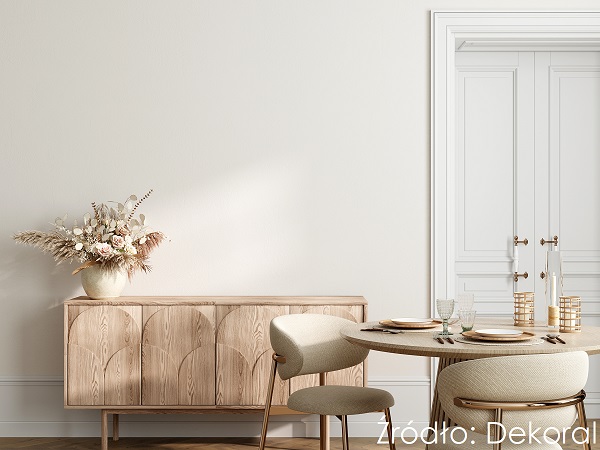 Wnętrze nawiązujące do francuskiego stylu można wykreować także w bardziej minimalistyczny sposób, bez zbędnego blichtru, bazując na stylowej oprawie ścian i jakości wykończenia. Ściana pomalowana kolorem Biały Naturalny z palety Dekoral Effect 3in1 zapewni jasną bazę, na której dyskretnie może zarysować się elegancja podwyższonych klasycznych drzwi i szerokie listwy przypodłogowe. Połyskujące w kolorze złota ramy nowoczesnych krzeseł i mosiężne stylowe okucia klamek, wprowadzą szczyptę wyrafinowania, w subtelny sposób nawiązując do pałacowego szyku. Harmonijne uzupełnienie stanowią wysokiej jakości meble z naturalnego drewna, jak okrągły stół czy rzeźbiona komoda w stylu art deco. W rezultacie w oprawie french chic tradycja może spotkać się z nowoczesnością, czerpiąc z inspiracji różnych epok dla stworzenia komfortowej przestrzeni w wysmakowanym stylu.