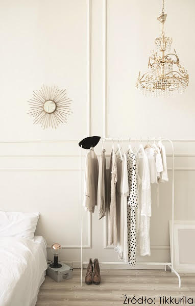 Zdobienia na ścianach i suficie w otoczeniu off-white to kolejny element kreujący styl francuski we wnętrzach. Sentymentalne złamane biele jak Bone czy Ivory z palety farb Tikkurila Optiva White, nadają pomieszczeniom przestrzenności i skutecznie wydobywają ozdobne sztukaterie. Kryształowe żyrandole, stanowiące kwintesencję paryskiego stylu, dekorują pomieszczenie nie tylko wdziękiem szlifowanego szkła, ale też odbijając światło w wielu kierunkach. Dzięki nim pomieszczenie nie potrzebuje wielu innych ozdób.