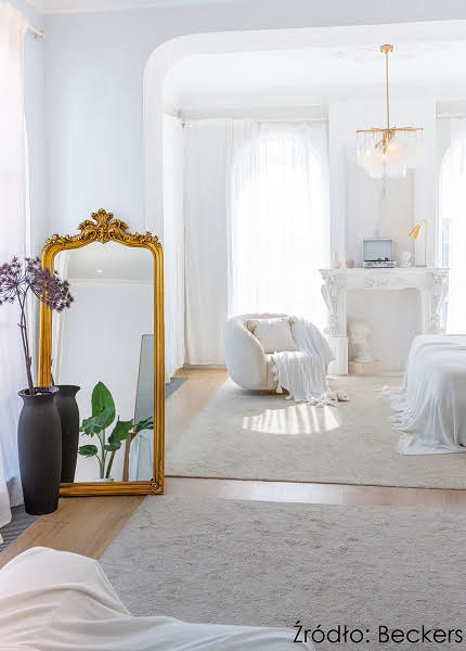 Postawienie na grę światła w przestrzeni i wyrazisty akcent z epoki to sprawdzony pomysł na urządzenie wnętrza w stylu francuskim. Dzięki dużym oknom z delikatnymi firanami wnętrze emanuje świetlistością, którą dodatkowo podbijają jasne ściany w odcieniu Silver Pearl z palety Beckers Designer Colour. Oparte o ścianę duże lustro optycznie podwyższa pomieszczenie, a złocona rzeźbiona rama akcentuje inspiracje francuskimi pałacami. W tej roli każdorazowo doskonale sprawdza się także stylizowany portal kominkowy, wprowadzając do wnętrza czar dawnej epoki. Mieniące się w złotych odcieniach lampy korespondują ze zdobnością luster, podkreślając wykwintność aranżacji. Opływowe wygodne meble w nowoczesnym wydaniu oraz miękkie tekstylia dodają wnętrzu lekkości i przytulności.