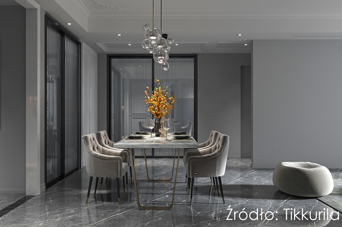 Ciekawą opcją na stworzenie jadalni w nowoczesnym stylu jest wykorzystanie popularnej koncepcji color drenching. Otulenie wnętrza wyrazistą szarością ścian M499 Cloak z palety Tikkurila Optiva oraz utrzymanie w tej samej gamie kolorów różniących się o kilka tonów podłogi, krzeseł i stołu pozwoli na niewielkiej przestrzeni wykreować nowoczesne, ale eleganckie wnętrze wpisujące się w gorące trendy dekoracyjne.
