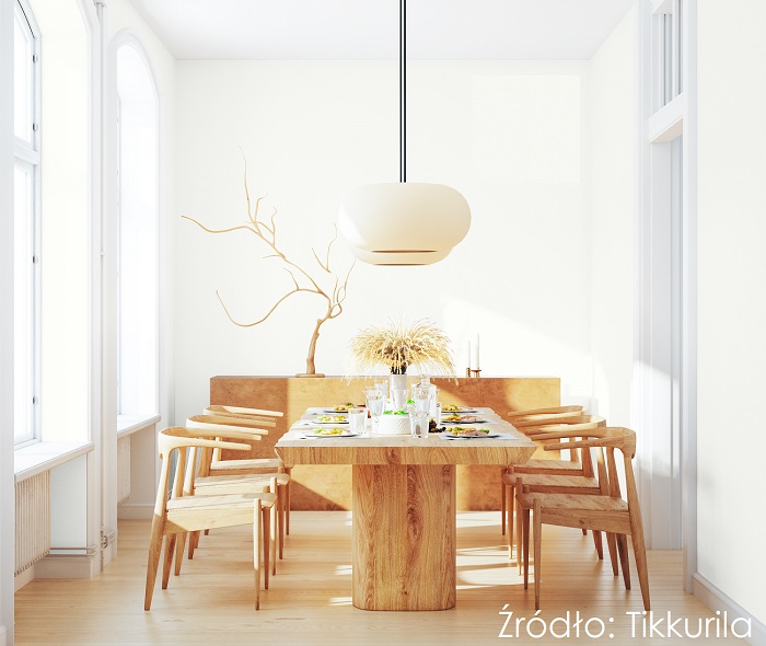 Zwolennicy klasyki i minimalizmu bez obaw mogą sięgnąć po biel. Choć ta sterylna traci na znaczeniu, to w trendach utrzymują się ciepłe, łagodne biele. Kremowy odcień Dove z palety farb Tikkurila Optiva White stworzy wysmakowane tło w przestrzeni jadalnianej. Chcąc dodać wnętrzu finezji bez nadmiaru dekoracji, warto postawić na krzesła w designerskim kształcie. Zestawienie ich z masywnym stołem z naturalnego drewna i oszczędną, ale niezwykle efektowną ozdobą z tego samego materiału, pozwoli połączyć w jadalni minimalizm z dekoracyjnym biglem.