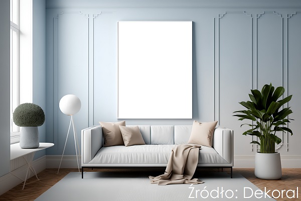 Aranżacja opierająca się na czystych liniach i delikatnym odcieniu Ulotna szarość z palety Dekoral Moc Koloru to przepis na wydobycie z salonu pałacowej przestronności przy zachowaniu ducha nowoczesnego minimalizmu. Połączenie stonowanego koloru ścian ze sztukaterią ułożoną w wąskie pasy od podłogi do sufitu powiększa optycznie przestrzeń, nadając jej lekkości. Prosta forma jasnej sofy oraz dekoracja w postaci dużego białego podobrazia wyznaczają nowoczesny styl i eksponują wrażenie otwartości. Chłodną kolorystykę ocieplają rośliny oraz przytulne tekstylia.