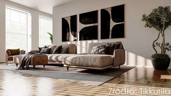 Czerpiąca z palety kolorów ziemi kompozycja oparta na beżach i naturalnym świetle to przepis na przestronny salon w kojącym wydaniu. Ściany pomalowane chłodnym odcieniem K481 Amulet z palety Tikkurila Optiva tworzą elegancką bazę dla cieplejszych tonów mebli i dodatków opartych na tej samej gamie kolorów. Wielkie okna wpuszczają dużo dziennego światła, delikatnie rozpraszanego przez delikatne firany. Dzięki ograniczeniu dekoracji do roślin i wpisującego się w konwencję kolorystyczną nowoczesnego tryptyku żaden przedmiot nie wybija się na pierwszy plan, ale wspólnie stanowią uporządkowane uniwersum, pozwalające w pełni wybrzmieć przestrzeni.