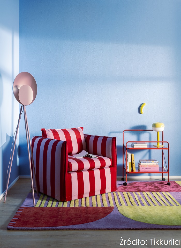 Z użyciem palety Tikkurila Expressive można też wykreować niecodzienne wnętrze, nadając barwom graficzną formę. Ściany w błękicie J356 Sky farb Tikkurila Optiva stworzą wyraziste, ale wyciszające tło dla dominującego fotela w czerwono-różowe pasy oraz kolorowego dywanu z geometrycznym wzorem w odcieniach fioletu, żółtego i bordo. Designerska lampa w pudrowym różu i prosty metalowy stolik pomalowany emalią Tikkurila Everal Aqua w czerwieni M316 Tomato wzmocnią zabawę kontrastami i proporcjami, składając się na wesołą przestrzeń z nutą ekstrawagancji.