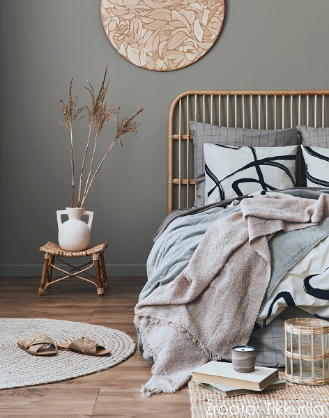 Sypialnia inspirowana azjatyckim minimalizmem to propozycja dla tych, którzy cenią harmonię i bliskość natury. Bambusowe oparcie łóżka, plecione dodatki oraz stonowane barwy tworzą kompozycję, która koi zmysły. Ściana w spokojnej szarości 1930 z palety Tikkurila Deco Grey doskonale łączy się z beżami i jasnym brązem na podłodze. Oryginalny niski stołek z plecionym siedziskiem z powodzeniem zastępuje stolik nocny, a delikatny pleciony lampion i dekoracyjne trawy w wazonie dopełniają aranżację w duchu zen stworzoną, być wsłuchać się w ciszę.