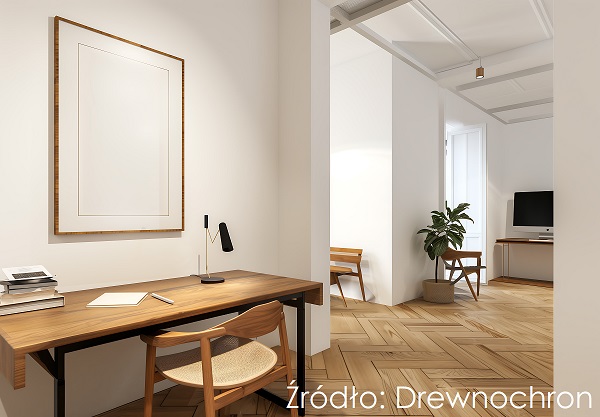 Wyeksponowany lakierem naturalny rysunek drewna sprawia, że podłoga może być nie tylko tłem, ale też kluczowym elementem wystroju minimalistycznego wnętrza. Ciepły odcień parkietu pokrytego Lakierem Drewnochron Parkiet Express harmonizuje z białymi ścianami i sufitami. Przestronne wnętrze nawet przy oszczędnych dekoracjach nie wydaje się puste.