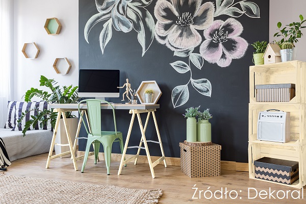 Wraz z wiekiem zmieniają się potrzeby młodego człowieka. Zamiast zabawek pojawia się coraz więcej książek, często komputer, nowe pasje. Dobrym pomysłem na łatwe i efektowne odświeżenie pokoju nastolatka jest samodzielne przemalowanie mebli na wybrane przez niego kolory. Drewniane skrzynki zamienione w regał nabiorą wyjątkowego charakteru dzięki emalii do drewna i metalu Dekoral Express Top w słomkowym odcieniu „Jak na lato”, tworząc spójny duet z lekkim biurkiem w tym samym odcieniu. Krzesło i akcenty dekoracyjne w miętowym kolorze nadadzą aranżacji lekkości oraz świeżości. Czarno-białe geometryczne motywy na tekstyliach i dodatkach sprawią, że przestrzeń będzie dynamiczna i młodzieżowa.