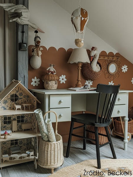 Dobrym sposobem na odświeżenie przestrzeni dziecka, które dopiero zaczyna szkołę, jest pomysłowe pomalowanie ścian. Nietuzinkowa lamperia w odcieniu Brownie z palety Beckers Designer Colour z białymi kwiatkami, zakończona uroczym rąbkiem, nada przestrzeni nieco bajkowy klimat, a jednocześnie wprowadzi dozę uporządkowania. W połączeniu z klasycznym szkolnym biurkiem w kolorze mięty i czarnym krzesłem retro sprawi, że wystrój pokoju będzie balansował na granicy dziecięcej beztroski i etapu pierwszych obowiązków. Elementy wyposażenia z naturalnych materiałów, np. wiklinowe kosze czy drewniany domek oraz ulubione zabawki sprawią, że pokoik będzie przestrzenią pełną ciepła, w której dziecko może się i bawić, i z przyjemnością zasiadać do lekcji.