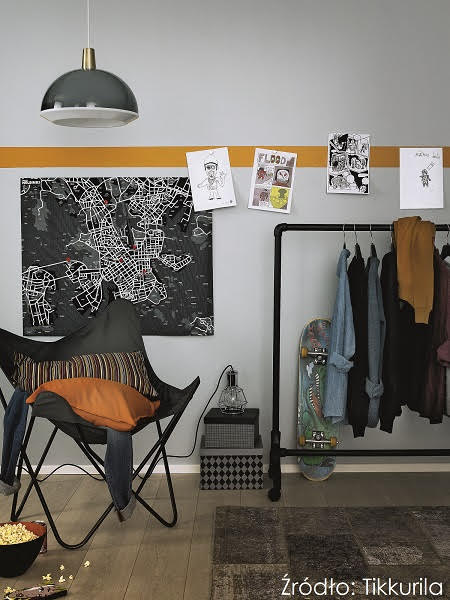 W pokojach dzieci niezależnie od wieku dobrze sprawdzają się rozwiązania funkcjonalno-dekoracyjne, które pozwalają personalizować przestrzeń. Magnetyczny pasek wykonany farbą Tikkurila Magnetic i pomalowany na pomarańczowy kolor farbą Tikkurila Optiva Matt 5, stworzy strefę na notatki, rysunki lub zdjęcia bez potrzeby zawieszania specjalnej tablicy. To praktyczne rozwiązanie ożywi i urozmaici ścianę pomalowaną spokojnym odcieniem S309 Equator Tikkurila Optiva Matt 5.