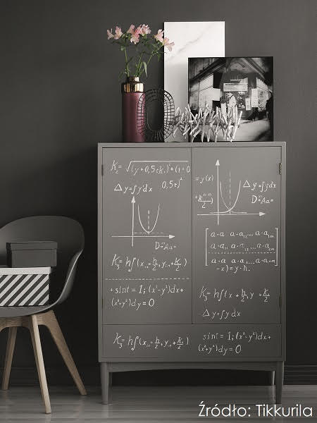 Innym pomysłem na stworzenie funkcjonalnej przestrzeni będzie wykorzystanie farby tablicowej Tikkurila Liitu, którą można pomalować nie tylko ścianę, ale także meble. Dzięki takiemu rozwiązaniu drzwiczki szafki staną się przestrzenią do notatek i rysunków w dowolnym z ponad 13 tys. odcieni, na które można zabarwić farbę tablicową Tikkurila. Malując szafkę na ciemnoszary kolor 1955, można ją zestawić z odcieniem ściany pomalowanej Tikkurila Optiva Super Matt 3 w kolorze 1949, osiągając modny efekt tzw. color drenching.